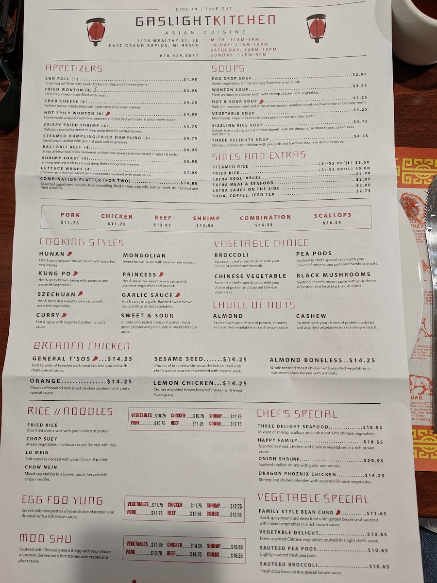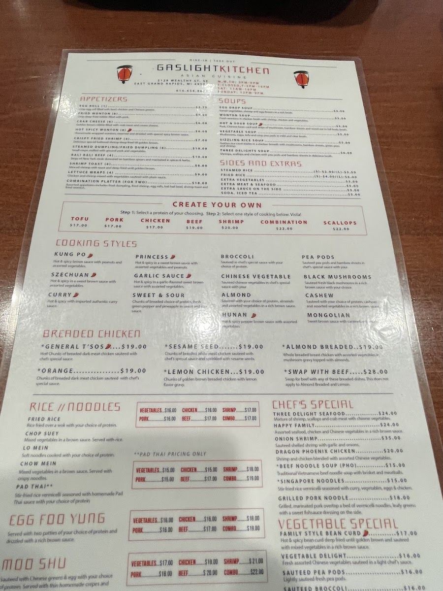 At Gaslight Kitchen Asian Cuisine Menu, you'll find an exciting blend of flavors from across Asia, brought together in a cozy and welcoming setting. Whether you’re craving something light like fresh spring rolls or ready to dive into a hearty bowl of pho or pad Thai, there's something to satisfy every taste. The menu is designed to take you on a journey through the diverse culinary traditions of the East, with each dish offering a unique taste experience. From the savory warmth of sizzling stir-fries to the delicate balance of spices in our curries, every meal is crafted with fresh ingredients and care. With every bite, you're not just enjoying a meal, you're tasting a story from the heart of Asian cuisine. Whether you're here for a quick lunch or a leisurely dinner, this menu promises to delight your senses and leave you coming back for more.